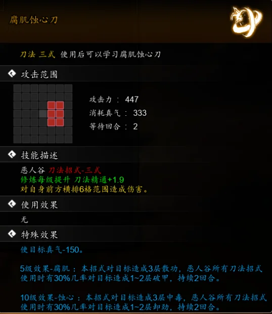 修炼提升一个等级之后是能刀法精通+1.9,对前方横排6格范围造成伤害。