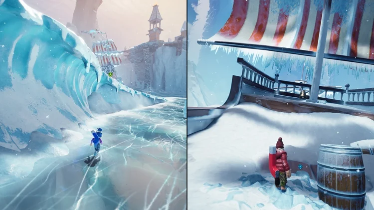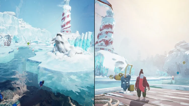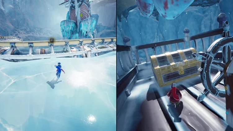 小节开始时剧情会带你来到一个水下基地(与年年有鱼同区域)。钻入水中并上浮,有一艘较大的海盗船在一冰悬崖处。进入海盗船,打开船尾的宝箱,戴上里面的海盗帽。