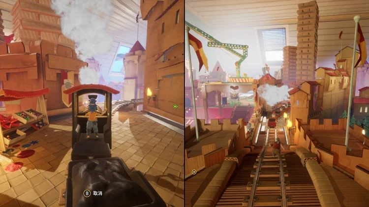 在小节开始后一路走到底会看到一辆黄色的玩具车。一位玩家进入车内另一位玩家将车后拉松开(注意幅度),瞄准天空中的圆环穿过即可。