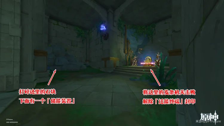 剧情结束后就是解谜环节,这里我们先做一下准备工作。到屋子里面,把发条机关击败,使「迁能终端」解除封印,并且把另一边墙角的石块打碎,露出里面的「储能装置」。