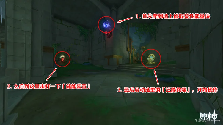 准备工作完成后,我们爬到这里的墙上拾取荒性能量块,之后击打刚才岩石下的「储能装置」,使其恢复运作,最后启动解除封印的「迁能终端」,开始操作。