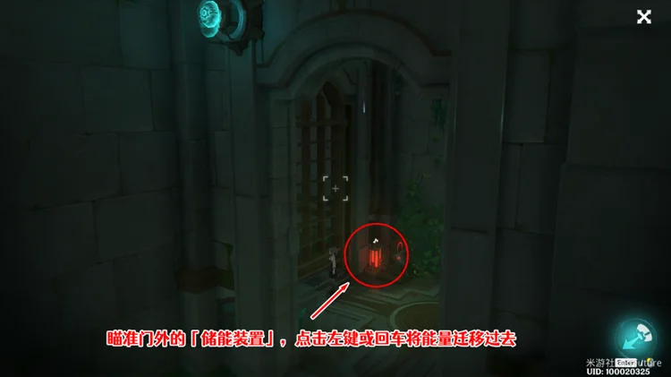这次切换视角后,我们就能看到门外的「储能装置」了,瞄准它按左键或回车将能量迁移过去。