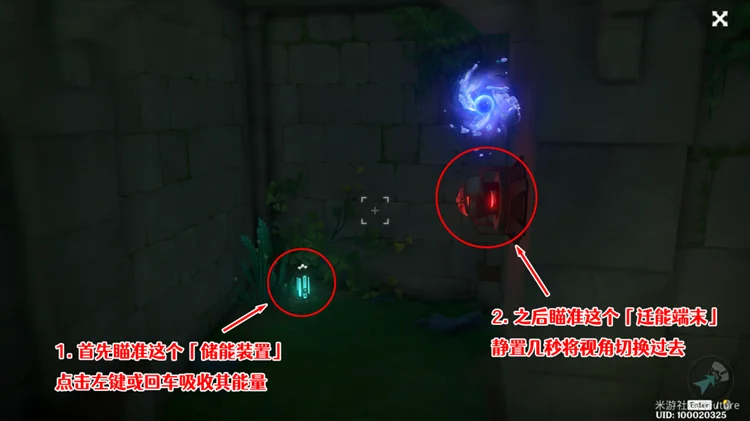 视角切换过去以后,我们就能看到刚才被我们激活的「储能装置」了。首先瞄准「储能装置」,按左键或回车吸收其能量,之后瞄准旁边墙上的「迁能端末」,静置几秒将视角切换过去。