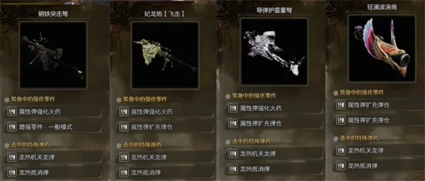素材武器里冰用钢铁弩、火用女王弩、雷用雷厄弩、水用狂澜弩