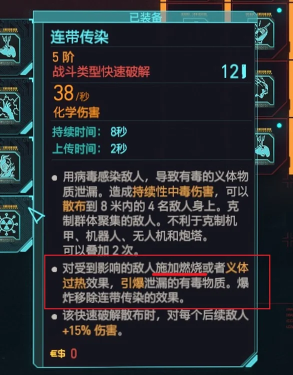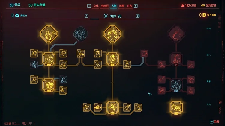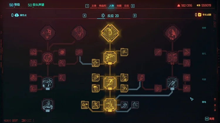 技术专长:点出大卫【边缘行者】这个不多说了,没有点满的原因依然是专长点合理分配,非核心点没有加。提一下【生化狂人】(填满义体栏可以减少所有义体冷却时间),因为这一套并不依赖主动触发的义体(比如时停等),所以基本不需要减义体cd,故没有点亮。