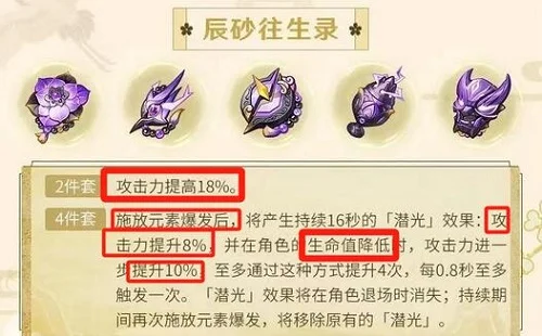 (2)备选辰砂四件套,首先,莱欧斯利作为纯粹的攻击力模型,攻击力加成的提升较为重要,其次,莱欧斯利自身所具有的耗血机制也十分契合辰砂四件套效果,因此可以作为逐影外的第二选择。