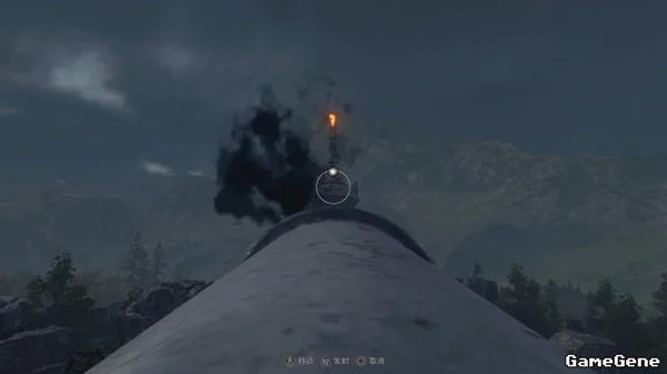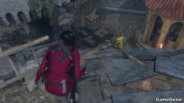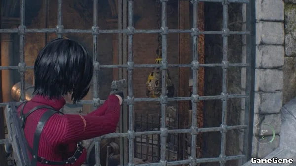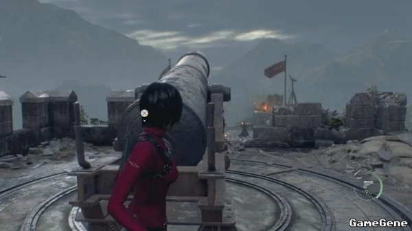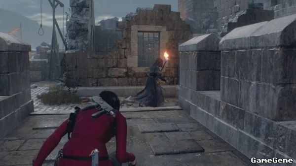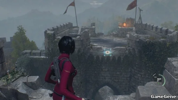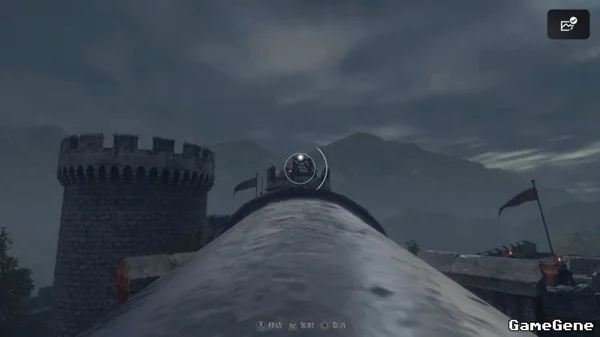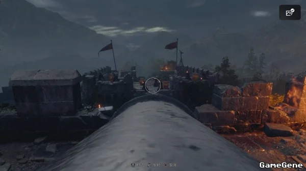 如图没有暗杀成功,触发警报了,那就在和正篇同一个位置,开枪打掉重物升上炮台,然后上楼梯使用绳枪上去,用跑到打城堡正门西北方的三个炮台。(ps:如图成功潜行的话,不要管这个炮台了,潜行状态升炮台会算作被发现,额外刷杂兵)