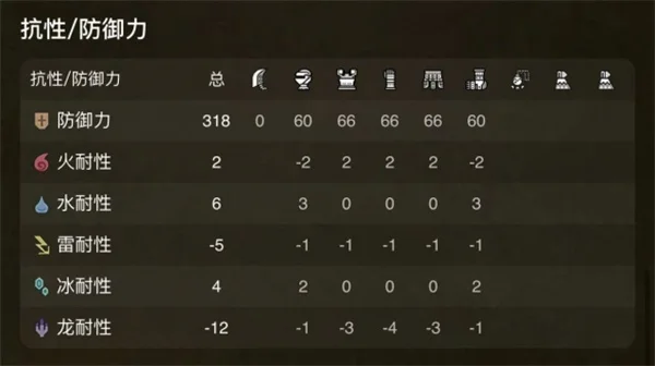 防御318、火耐2、水耐6、雷耐-5、冰耐4、龙耐-12