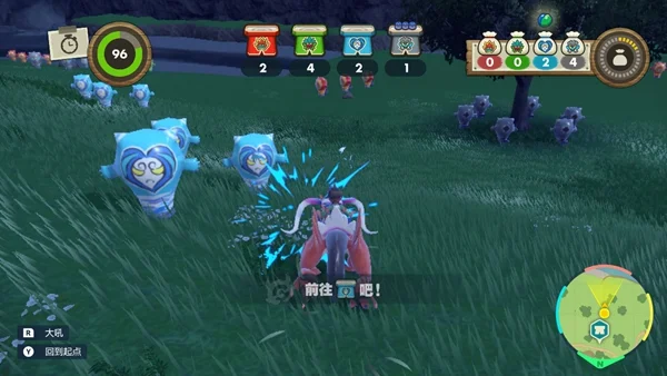 3、打鬼祭区域内设有4种颜色的鬼气球,撞破鬼气球后就可以拾取其中的树果,在据点设有4个,不同颜色的树果台。按A键可将树果放到对应颜色的树果台上,放上规定数量的树果即可完成,有时贪吃鬼宝可梦会吃掉树果台的树果而聚集过来,如果放任不管,树果就会不断被吃掉,因此要用R键来吓唬并赶走他们吧。