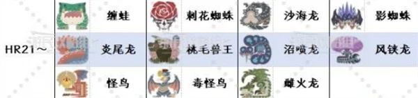 缠蛙、刺花蜘蛛、沙海龙、影蜘蛛、炎尾龙、桃毛兽王、沼喷龙、风铗龙、怪鸟、毒怪鸟和雌火龙。