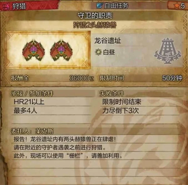 4、狩猎两只【赫猿兽】后回去找【莱克斯】交任务就能拿到【力量护符】。