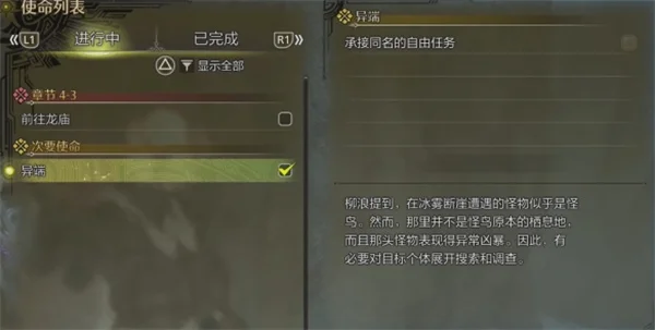 1、在冰雾断崖区域20的位置找到柳浪,对话后接受次要使命异端。