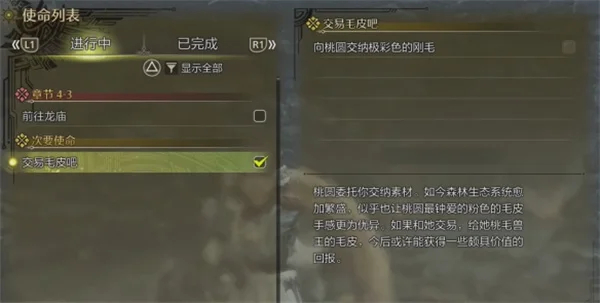 4、最后回去找到桃圆,将桃毛兽王的毛皮交给它,就可以完成这个次要使命了。