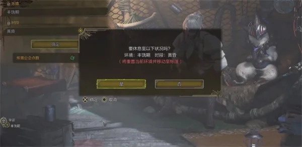 3、进入到帐篷中,把环境调成丰饶期,把时间调成早上或者黄昏。