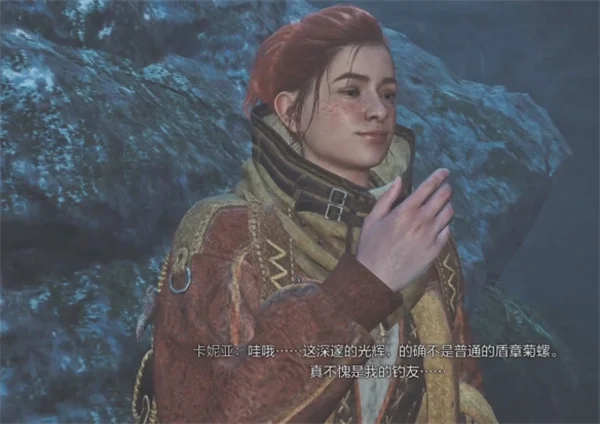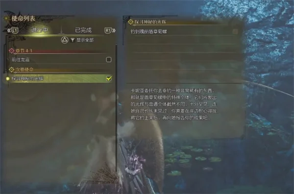 1、接取探寻神秘的光辉使命,卡妮亚委托我们去钓瑰丽盾章菊螺。