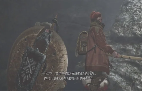 1、根据卡妮亚的提示,我们要去光线昏暗的地方钓鱼。