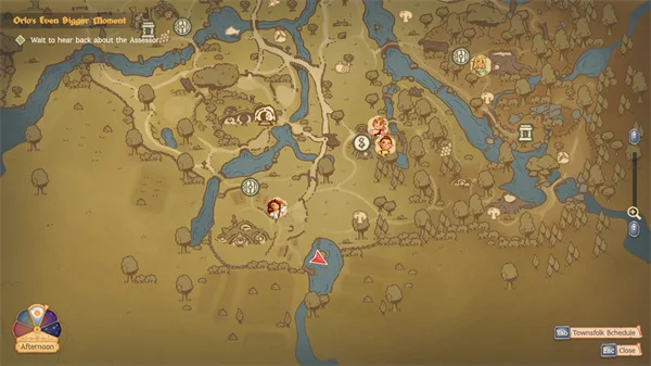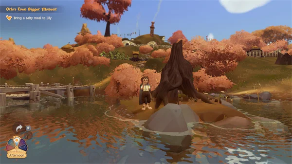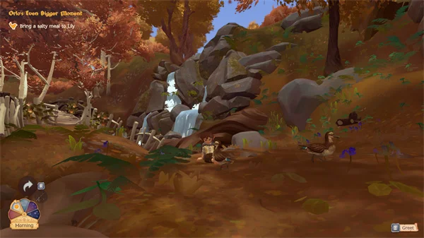 穿过白色的桥,与瀑布边缘附近的发光点互动。