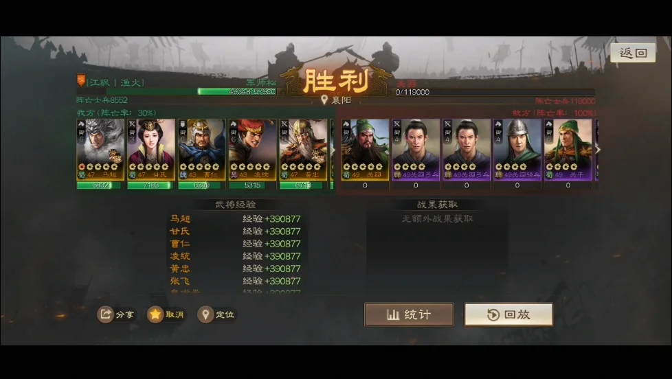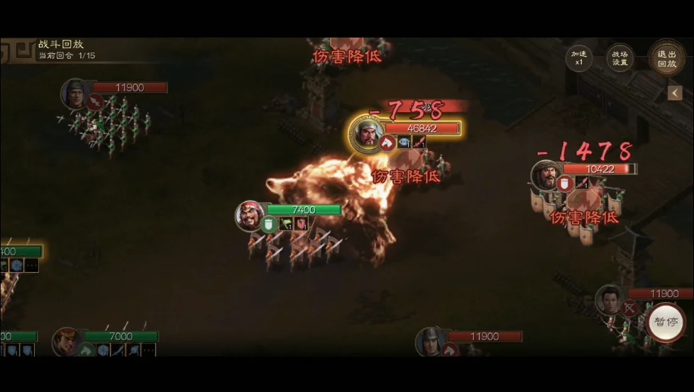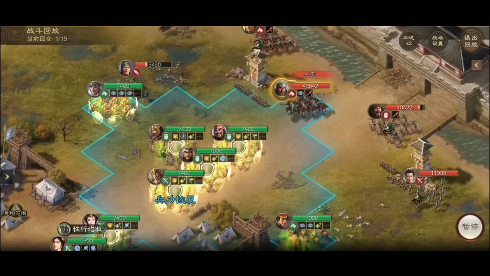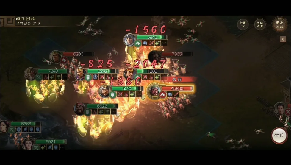 4)后续回合要注意武将站位,尽量避免多位武将集中在一起,虽说关羽被减攻击了,但他使用威震华夏打到多人的话,己方队伍会扛不住。