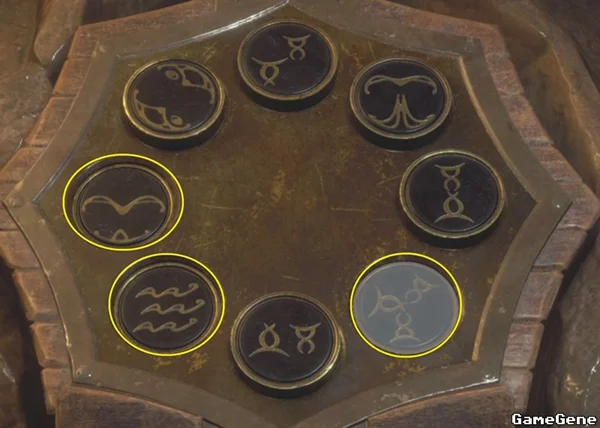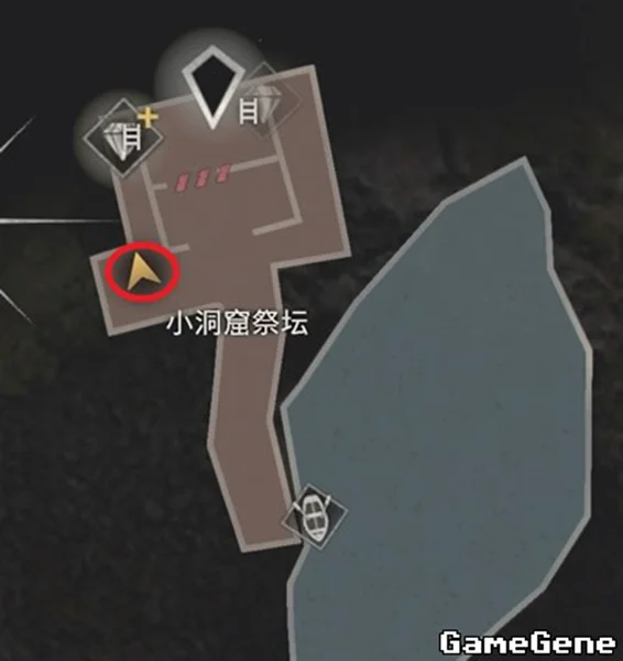 向小屋内走,输入4点5点,7点8点,9点三个方向的三个按钮,按钮提示在小洞窟祭坛1楼左侧尽头和2楼画出来了。