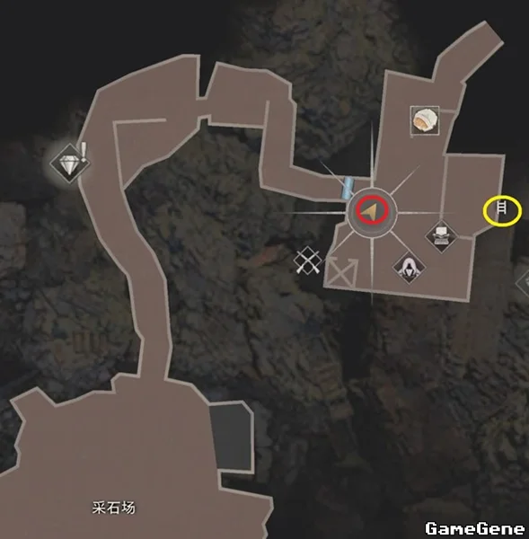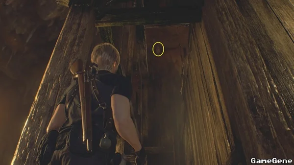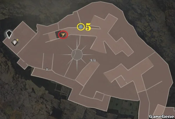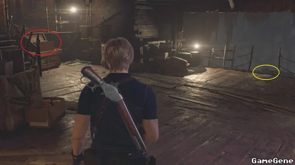 从靶场出来,商人附近的木柱上贴着文件【商人贴士:回头钱】,左侧红圈内的宝箱,有关键物品:六边形拼图A,拿完后从黄圈梯子跳下去来到下一层。