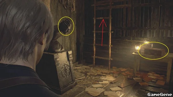 进门后,左侧雕像拿到关键物品:亵渎者头雕,右侧桌子上的宝箱有关键物品:六边形拼图C。然后跟着红色箭头爬梯子上去。