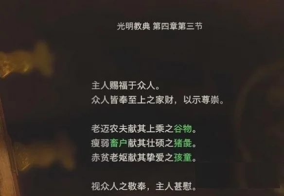 2. 村长宅邸走楼梯上二楼,桌上看到文件【光明教典 第四章第三节】。