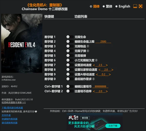点击简体、繁体、English,可以切换语言 (切换语言后修改器将把该语言设置为默认语言)