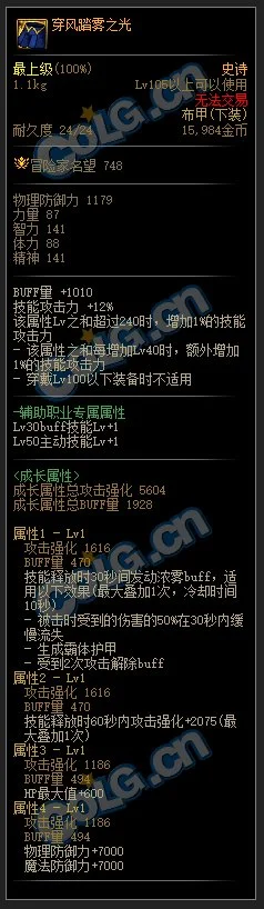 dnf穿风踏雾之光是新版本大魔法师的次元回廊地图中的史诗装备,具体属性可以见上图。