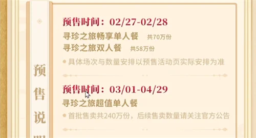 不过大家要注意的是,本次预售大家是无法立刻获取到套餐的,套餐要等到4月3号才可以吃,现在只是预售,并且套餐都是有数量限制的,单人套餐:70W份,双人套餐:58W份。