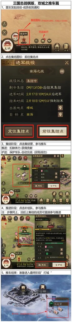 推车知识点:收到通知——前往集结点——集结阶段:点击集结营,参与推车——推进阶段:点击补给队,参与推车——推车结束:准备进入最终阶段”打城“