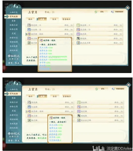 下面有两张图来对比,升级前都把灵炼拉满和直接升级后再灵炼,可以看到,基础数值差不多,但是多出来的百分比加成、多一倍命中率和额外的暴击率才是弯道超车珍贵的属性。