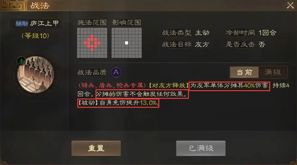 陈武的面板和兵种情况和朱恒类似,自带战法则是为指定友军分担伤害,只要锁定之后,哪怕被敌方使用强制位移战法分割阵型,这个效果也依然生效,是一个非常霸道的保护型战法。同时被动效果还能给自己提供高额的免伤效果,生存能力极佳。