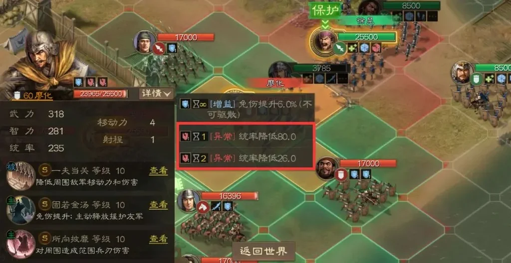 因为这两名武将的自带战法,均有降低目标统率值的效果,最大的优点就是不怕打不动人。两个武将联合点杀,可以将目标的统率值大幅降低,显著削弱目标的防御能力,轻松完成单点突破,而后逐个击杀。