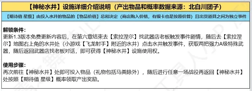 火焰纹章Engage神秘水井产出物品查询表。不少玩家可能还不太清楚这个设施都可以产出什么物品,下面带来具体的介绍,供各位玩家们参考。
