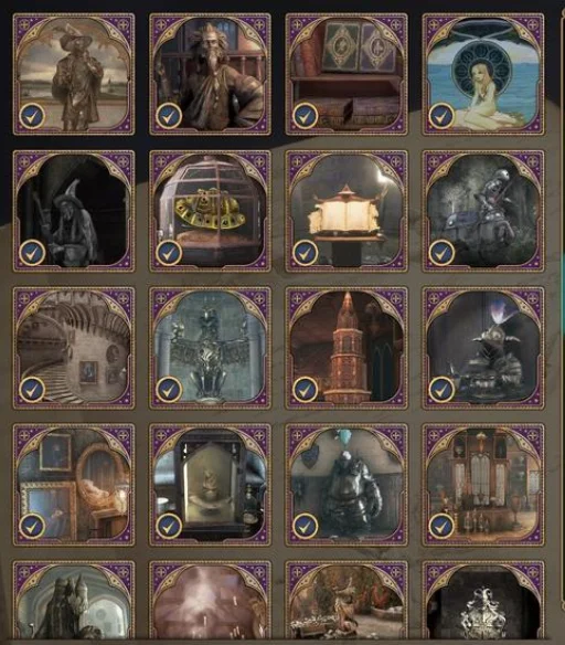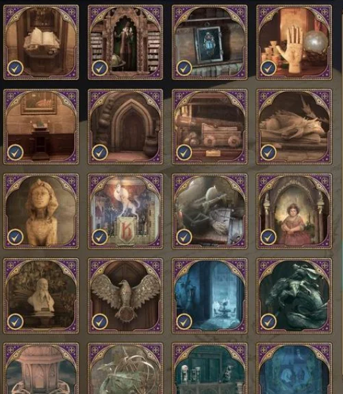 p5从左到右:家养小精灵菜谱,初代图书管理员,被施法的书籍,手相术模型。 中级变形术,炼金术课程,重要的麻瓜法器,眠龙雕像。 斯芬克斯雕像,狼人传奇挂毯,管理员的工具,胖妇人肖像。 拉文克劳半身像,拉文克劳门环,忌辰晚会房间,水妖雕像。 斯莱特林水池,飞龙喷泉,拘留室,无头猎手挂毯。