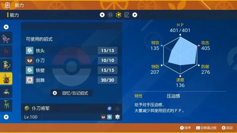 对于铁斑叶,目前只推荐使用仆刀将军。恶属性免疫超能的招式,钢属性直接砍半铁斑叶的叶刃和超级角击。开局铁斑叶会使用剑舞加强一次,此时它打100级252HP的仆刀将军只需要三次叶刃,且速度高过仆刀将军。因此推荐仆刀将军携带贝壳之铃,并且在第一发被打中的情况下只剑舞一次,开始仆刀磕头。如果铁斑叶用超级角击,那可以稳定剑舞三次,再仆刀。铁斑叶一般也会在第四回合清一次能力变化。