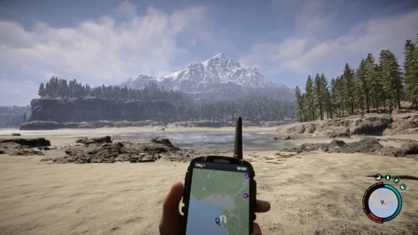 这里顺着河流走往上走能在小地图上看到一个蓝色标志,那里有一个废弃的吉普车,旁边1米处就是洞穴,进去后能找笔记本电脑3D打印喝水的壶,比较重要的道具。
