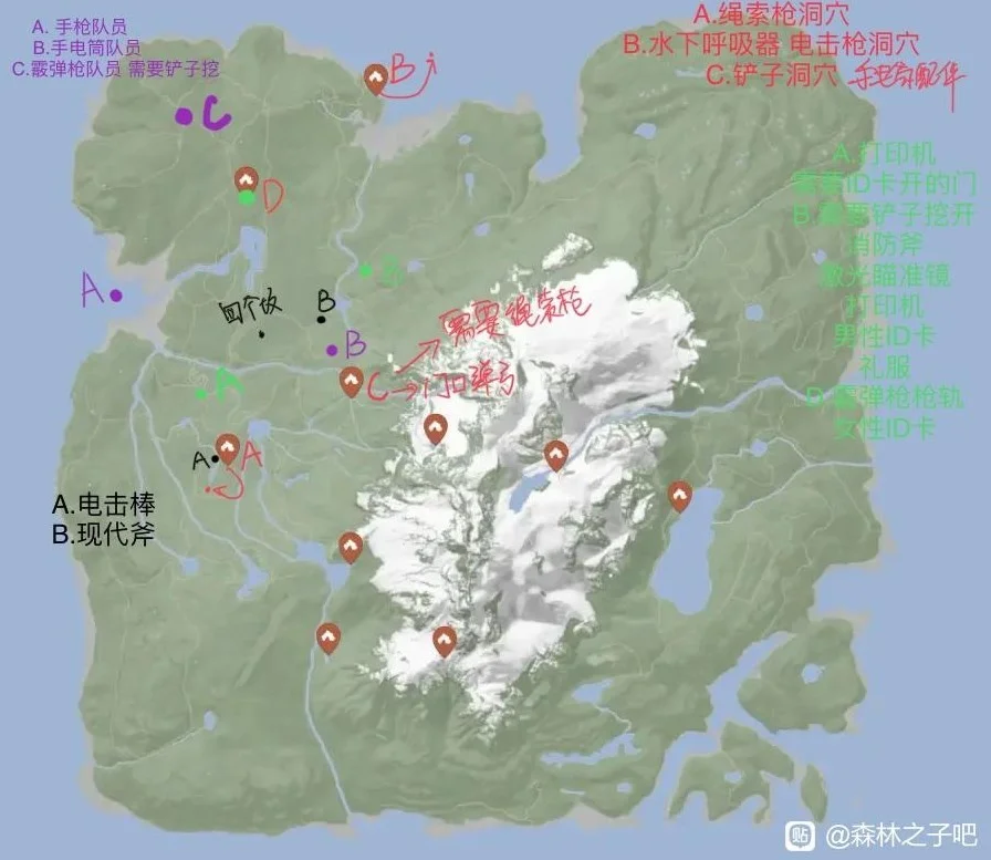 森林之子地图中各个重要物品在哪?部分玩家可能还不清楚,下面一起来看看森林之子地图重要物品点位标注吧。