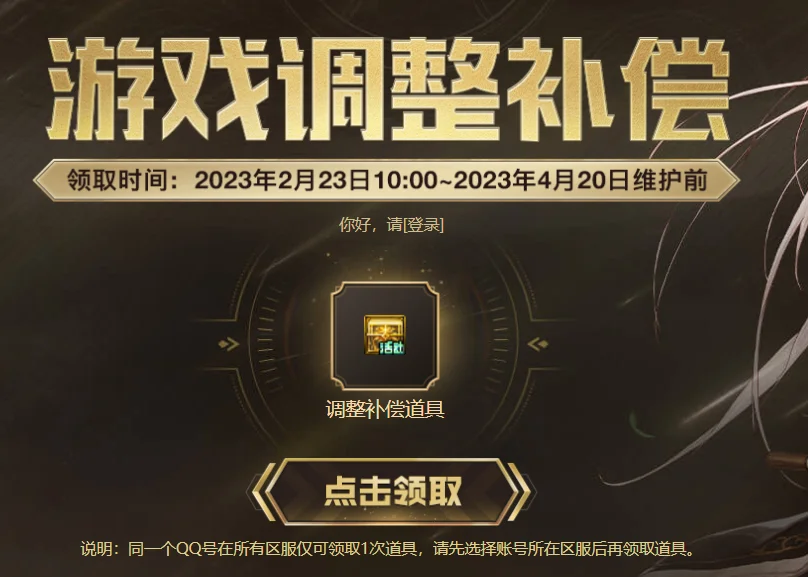 2、同一个QQ号在所有区服仅可领取1次道具,请先选择账号所在区服后再领取道具。“调整补偿道具”仅限游戏注册时间在2023年2月22日18:00:00之前,腾讯游戏信用≥100,且账号内至少拥有一个游戏等级85级及以上角色的账号可以领取。
