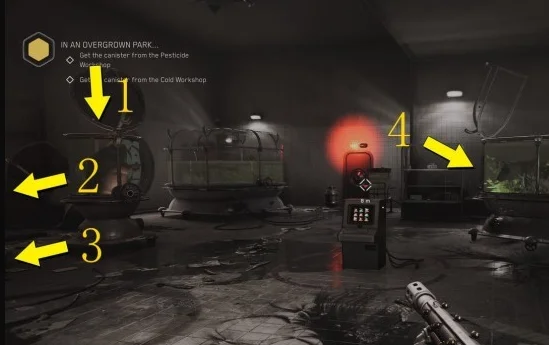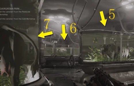 在主线目标“在那草木疯长的园区…”中,我们需要寻找4个罐子。其中一个罐子所在的房间内有很多水箱,这些水箱内都关着动物,房间中央还有一个操作板,上面是一个动物九宫格。