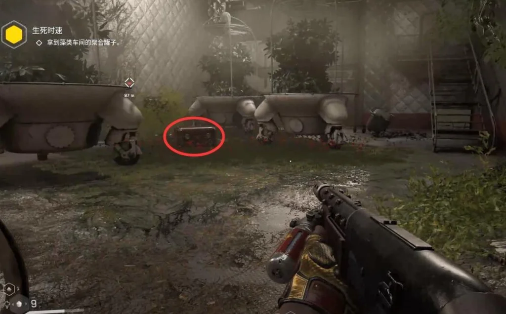 追上彼得罗夫的尸体后回到大厅。进藻类车间打僵尸之前,先探索走廊,藻类车间和高温车间之间有个门,进去打开箱子得到【电击插装模块蓝图】。