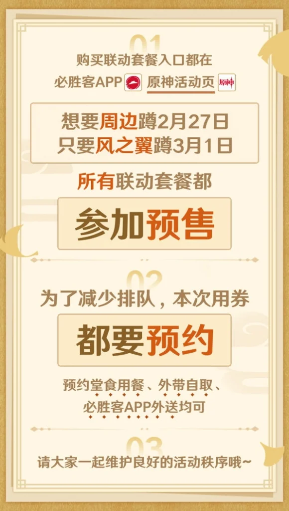 为保证活动秩序及各位旅行者的用餐体验,本次联动需通过预售餐券、预约用餐时间并核销用券来享用联动套餐。