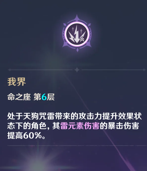 九条裟罗是雷系专辅,满命的效果是给受到攻击力加成的角色增加60%的雷元素暴击伤害,这个提升是非常恐怖的,因此满命九条又称“雷系外置爆伤头”、“雷系第7命座”。因此我更加推荐在九条有了6命之后,再去培养更好。当然在没有满命的时候,九条也是可以练的,因为她的E技能是给场上角色增加攻击力,和班尼特Q类似。