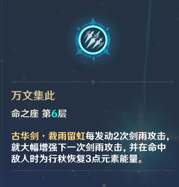 行秋6命不仅可以提升自身大招的伤害,更关键是可以给行秋回复能量,彻底解决充能问题。有了6命之后行秋可以在圣遗物中专心提升提双暴,进一步提升伤害,甚至可以携带双暴武器。行秋元素战技倍率本就不低,6命解放充能提升双暴的行秋,二踢脚能打个小核爆,真正晋升为6星水神。