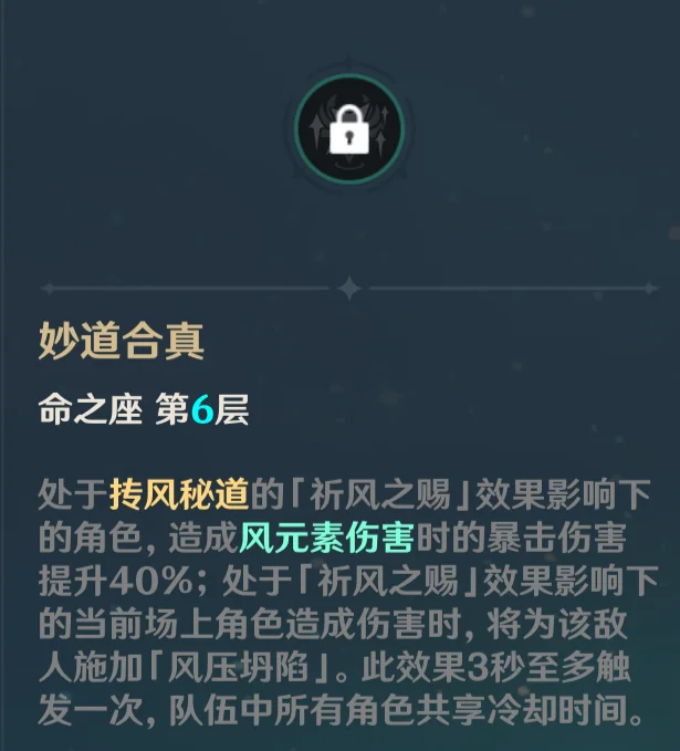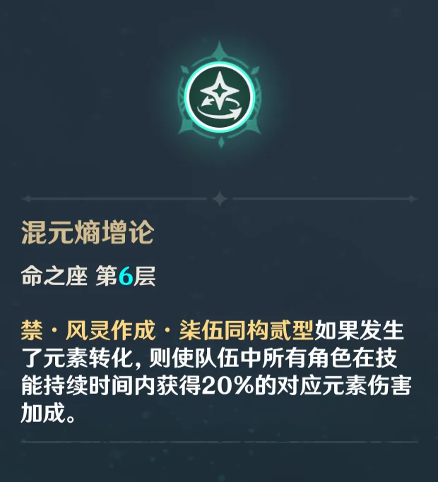 砂糖在6命之前的辅助效果,除了风套减抗外,主要是两个天赋给队友加精通,有了6命之后,队伍角色获得20%对应元素伤害加成,补上元素增伤乘区,让自己的辅助能力更加全面,因此砂糖的6命也是非常关键的。