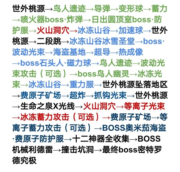 好像很多人也是迷路迷的很厉害,所以大概做了这么一个流程图。可以知道完成什么之后大致该去哪里,为了不破坏探索体验所以只写了大地图。