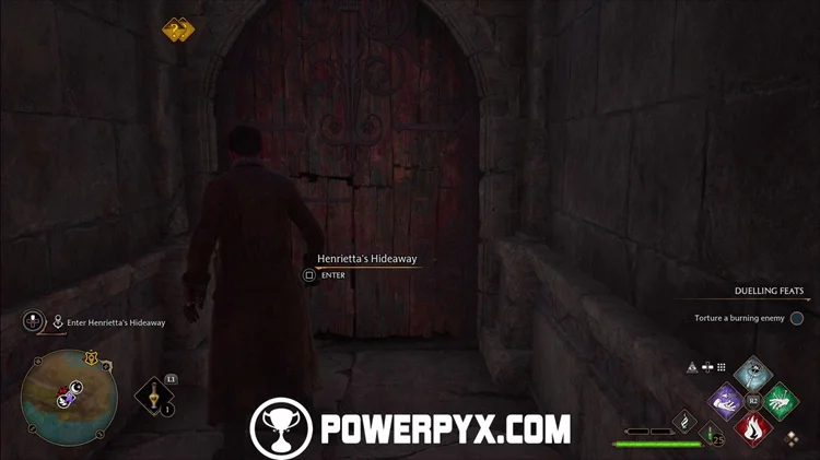 按照任务标记找到亨丽埃塔的世外桃源。入口在梅林斯审判的下面,就在审判旁边的楼梯上。