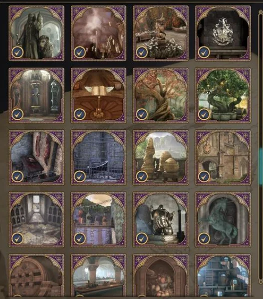p5从左到右:家养小精灵菜谱,初代图书管理员,被施法的书籍,手相术模型。 中级变形术,炼金术课程,重要的麻瓜法器,眠龙雕像。 斯芬克斯雕像,狼人传奇挂毯,管理员的工具,胖妇人肖像。 拉文克劳半身像,拉文克劳门环,忌辰晚会房间,水妖雕像。 斯莱特林水池,飞龙喷泉,拘留室,无头猎手挂毯。