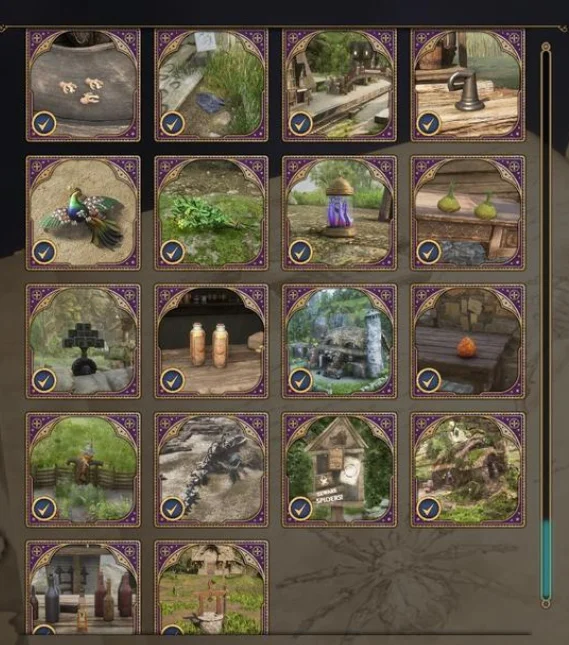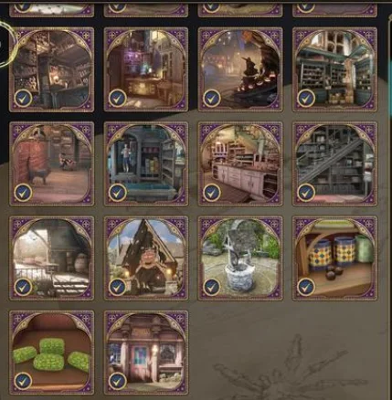 p2从左到右:姜根,赫布底里群岛黑龙鳞片,霍格莫德车站售票厅,古董号角。 珠宝胸针,独活草花束,莫特拉鼠胡须,潘古斯葱球。 秘鲁隐身烟雾弹,南瓜汽水,哑炮小屋,如尼纹蛇蛋。 魔法稻草人,巨龙骷髅,蜘蛛警告标志,歪倒之屋。 八眼巨蛛毒汁,费德罗特水井。