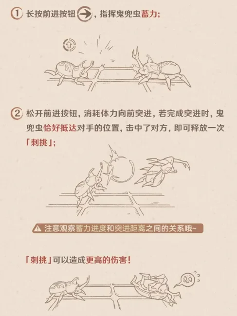 松开前进按钮,消耗体力向前突进,若完成突进时,鬼兜虫恰好抵达对手的位置,击中了对方,即可释放一次「刺挑 ] ;